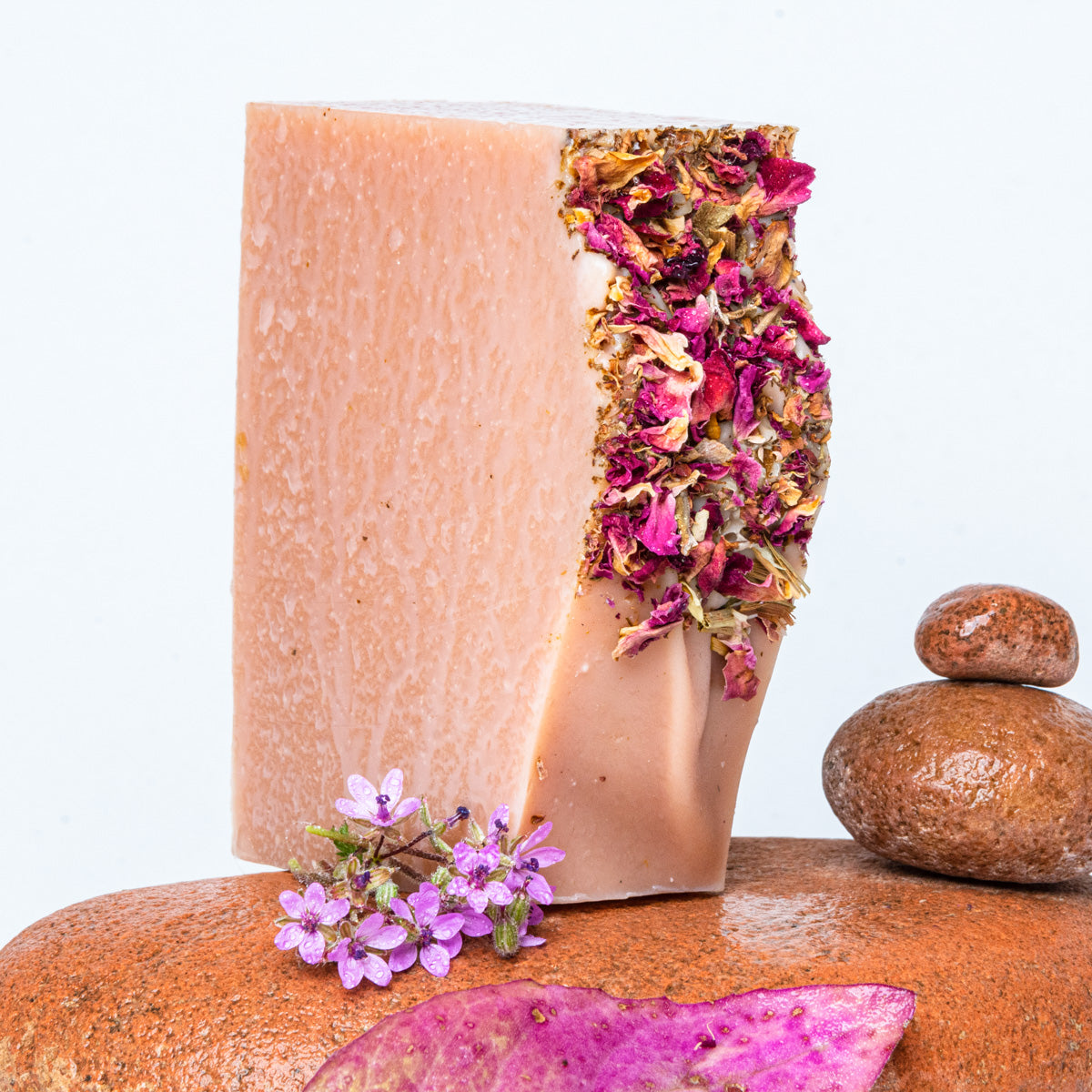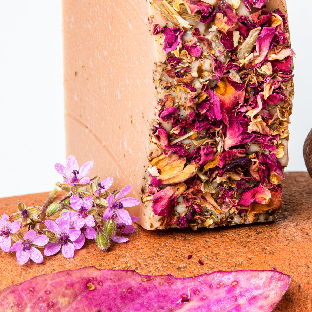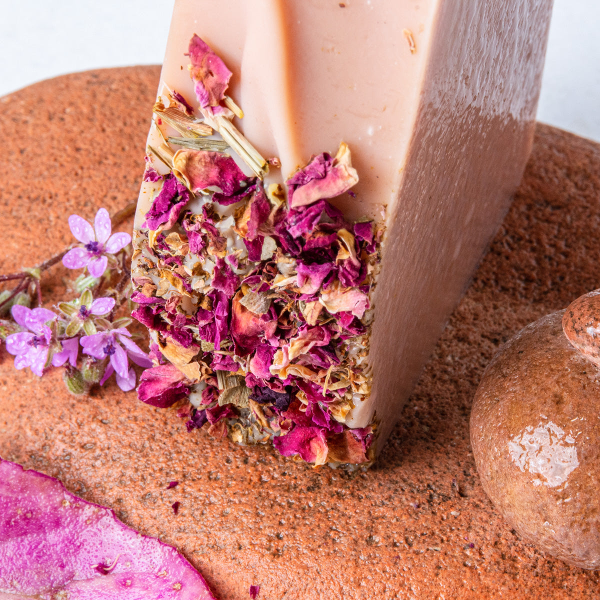 Aceite de oliva, aceite de coco, agua destilada, hidróxido de sodio, manteca de karité orgánica, manteca de cacao orgánica, aceite de ricino, aceites esenciales de pomelo, bergamota y geranio rosa. Coloreado con arcilla de caolín rosa y cubierto con pétalos de rosa secos.
