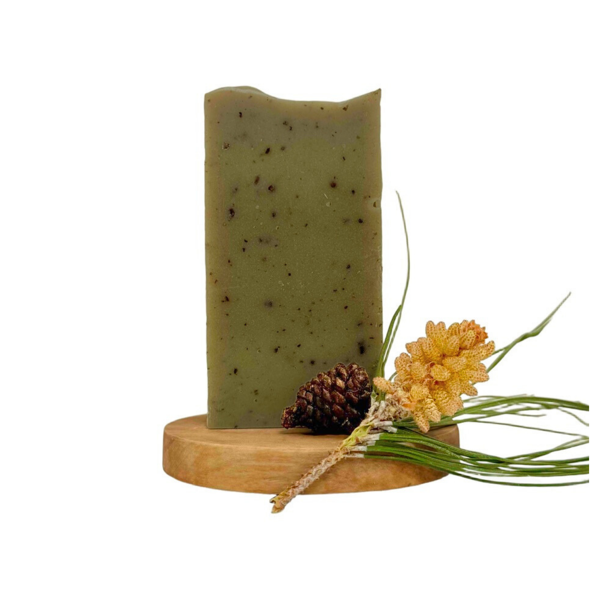 Its soft green tone comes from spirulina, a mineral-rich botanical powder valued for its natural color and plant nutrients. Crushed juniper berries add gentle texture and a visual connection to the ingredients within the bar.